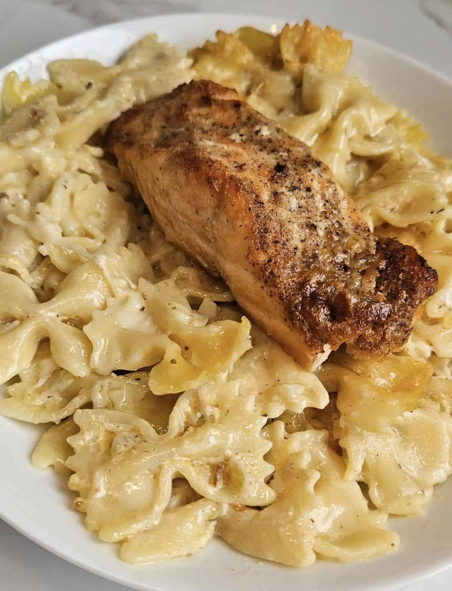 • Season one fresh salmon fillet with Italian seasonings salt and pepper. Next, add the cooked onions and garlic to a small baking dish, along with semi cooked pasta, vegetable stock, heavy cream, Dijon mustard and remaining seasonings to taste.